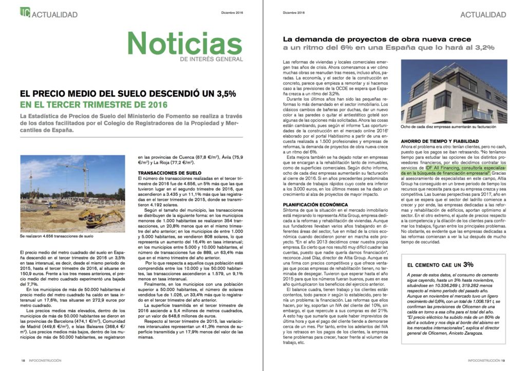 Pasamos a otro medio especializado, Infoconstrucción, una de las revistas líderes de su sector y que se distribuye por suscripción. En este caso quisieron completar un reportaje sobre el precio del suelo con el testimonio de uno de nuestros clientes, Altia Group, empresa encargada a la rehabilitación de viviendas que gracias a nuestro trabajo consiguió la financiación que necesitaba para crecer y consolidarse en el mercado.